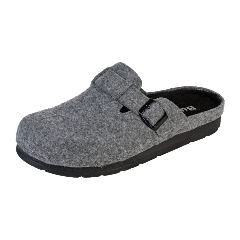 A BZ455 férfi egészségügyi papucsok nagyon kényelmesek és meleg házi cipők. A papucs felsőrésze természetes gyapjú filcből készül. A természetes gyapjú filcet bárányok gyapjának filcben történő feldolgozásával állítják elő. Az egyedi szerkezetének köszönhetően a filc megtartja a cipőben a száraz és meleg mikroklímát, biztosítja a levegő természetes keringését, ami közvetlenül érvényesül a megfelelő lábhygiéniában, garantálja a kényelmet és a frissesség érzését egész nap. Az ilyen cipő egészséges és antiallergén. Oldalt fémcsattal rendelkezik, amellyel a cipőt a sarok magasságához lehet igazítani. A bélés alatt szuper puha hab található - amely további kényelmet biztosít a járás során.