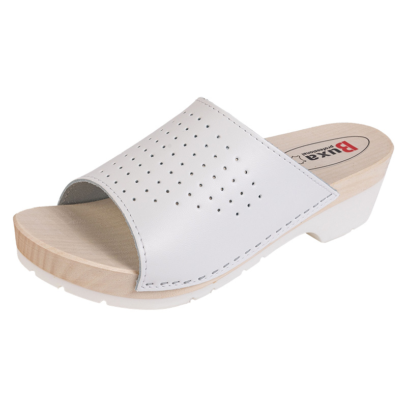 HasználatMunkacipők egész napos viseletre az egészségügyben, konyhában, de papucsként is használhatók különféle iparágakban A csúcs Dupla természetes bőr, speciális fóliával borítva perforáció nélkül, bőrszíjjal, csattal a lábfejen BelülBelseje teljes kiőrlésű bőrrel bélelt, anatómiailag formázott talpán, finom perforációkkal a szellőzés érdekében.Egyetlen Kiváló minőségű csúszásmentes poliuretán talp fehér vagy fekete színben ütéselnyelő talpbetéttelMagasság 4,5 cm-es sarok 2 cm-es talpvastagsággal BefogásBőr szíj csattal G méretben Szélesség Közepes és széles lábfejekhez TanúsítványEN-20347, CE tanúsítvány - Megfelelőségi tanúsítvány Méretek35-42Rsebesség és szállítási lehetőségek