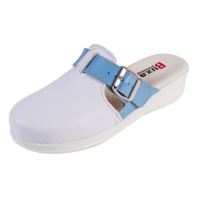 HasználatMunkacipők egész napos viseletre az egészségügyben, konyhában, de papucsként is használhatók különféle iparágakban A csúcs Dupla természetes bőr, speciális perforált fóliával borítva, valamint csattal ellátott bőrszíj a lábfejen és a sarokban BelülBelseje teljes kiőrlésű bőrrel bélelt, anatómiailag formázott talpán, finom perforációkkal a szellőzés érdekében.Egyetlen Kiváló minőségű csúszásmentes poliuretán talp fehér vagy fekete színben ütéselnyelő talpbetéttelMagasság 4,5 cm-es sarok 2 cm-es talpvastagsággal BefogásBőr szíj csattal G méretben Szélesség Közepes és széles lábfejekhez TanúsítványEN-20347, CE tanúsítvány - Megfelelőségi tanúsítvány Méretek35-42Rsebesség és szállítási lehetőségek