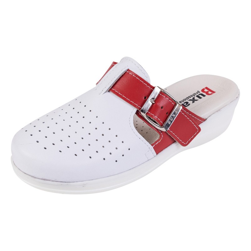 HasználatMunkacipők egész napos viseletre az egészségügyben, konyhában, de papucsként is használhatók különféle iparágakban A csúcs Dupla természetes bőr speciális perforációval borított fóliával és csattal ellátott bőrszíjjal a lábfejen BelülBelseje teljes kiőrlésű bőrrel bélelt, anatómiailag formázott talpán, finom perforációkkal a szellőzés érdekében.Egyetlen Kiváló minőségű csúszásmentes poliuretán talp fehér vagy fekete színben ütéselnyelő talpbetéttelMagasság 4,5 cm-es sarok 2 cm-es talpvastagsággal BefogásBőr szíj csattal G méretben Szélesség Közepes és széles lábfejekhez TanúsítványEN-20347, CE tanúsítvány - Megfelelőségi tanúsítvány Méretek35-42Rsebesség és szállítási lehetőségek
