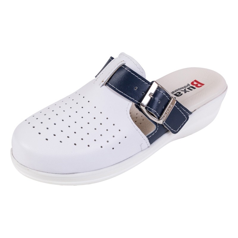 HasználatMunkacipők egész napos viseletre az egészségügyben, konyhában, de papucsként is használhatók különféle iparágakban A csúcs Dupla természetes bőr, speciális perforált fóliával borítva, valamint csattal ellátott bőrszíj a lábfejen és a sarokban BelülBelseje teljes kiőrlésű bőrrel bélelt, anatómiailag formázott talpán, finom perforációkkal a szellőzés érdekében.Egyetlen Kiváló minőségű csúszásmentes poliuretán talp fehér vagy fekete színben ütéselnyelő talpbetéttelMagasság 4,5 cm-es sarok 2 cm-es talpvastagsággal BefogásBőr szíj csattal G méretben Szélesség Közepes és széles lábfejekhez TanúsítványEN-20347, CE tanúsítvány - Megfelelőségi tanúsítvány Méretek35-42Rsebesség és szállítási lehetőségek